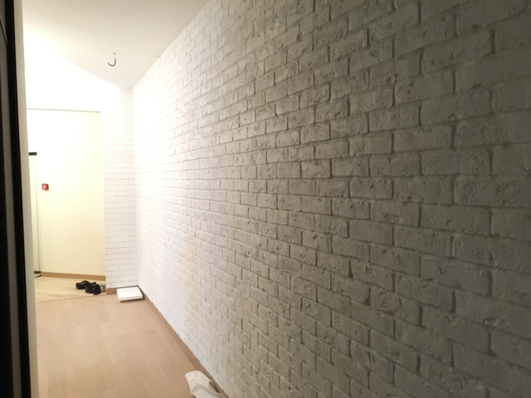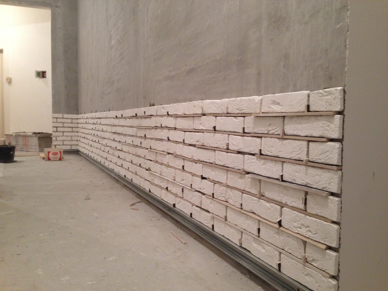 Достаточно оштукатурить стену, выровнять пооскость. Шпаклевать не нужно. Далее купите клей для этого кирпича у производителя (по сути плиточный клей подойдет, но лучше пользоваться рекомендованным клеем). Естественно прогрунтуйте стену обычной грунтовкой. Далее укладывайте по уровню. Для ровных швов можно купить пластиковые кабель каналы (для электрики предназначаются) шириной 1см. В швах между кирпичом их прикручивайте на саморезы, временно, чтобы соблюсти ровность швов. Ну и все) демонтируете пластиковые кабель каналы, делаете затирку (лучше специальным пистолетом, чтобы не испачкать кирпич в лицевой стороны. Затирка также производителя, цвет, зернистость выберете по душе. Когда вае сделано и высохло - покрасте белой краской! Готово:) Ps: может сумбурно написал, если что-то не понятно, напишите)