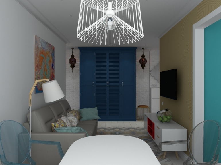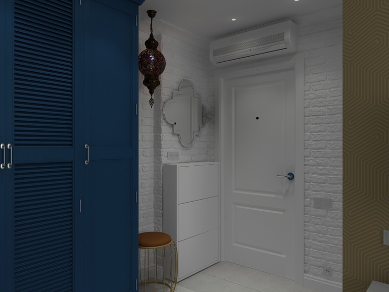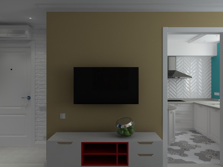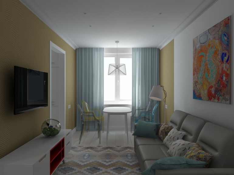 Далее, опираясь на письма и пожелания заказчика, получился интересный и эклектичный проект гостиной и коридора.