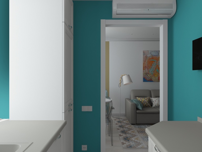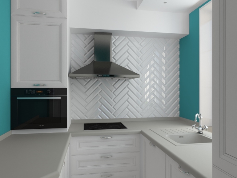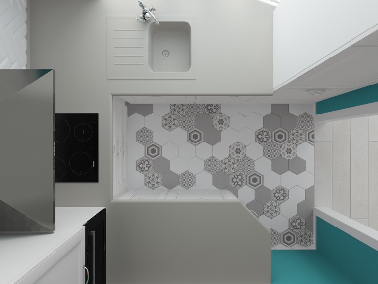 Замечательный проект у вас получился! И снова мой любимый бирюзовый цвет) Жанна, скажите, пожалуйста, а как-то используется пространство под духовым шкафом? Там просто полки или карусель? И раскладка плитки меня покорила - и на стене, и на полу!