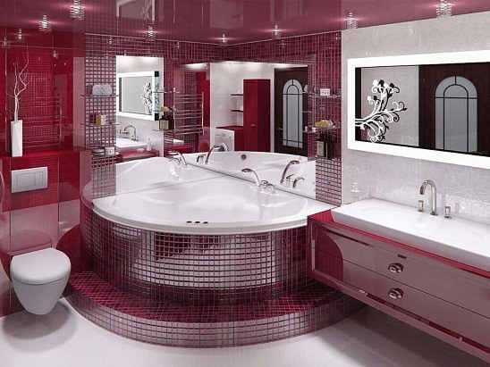 везде плитка. Мозаика только в отделке ванны и зеркал над ней + в ниши над унитазом.