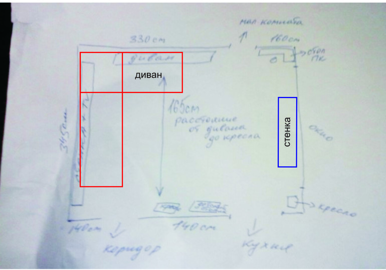 Угловой диван планируем ставить на место того дивана, что стоит сейчас, при чем угол будет как бы делить комнату по полам, либо второй вариант (но менее нравящийся мужу), поменять местами диван со стенкой, и угловой диван поставить в угол, но та стена тоже не большая и диван будет выпирать на вход, будет мешать ходить, ставить к окну не вариант, окно низко, диван перекроет его практически полностью, да и "нога" тоже будет мешаться, при открывании двери в мал. комнату (см. схему).