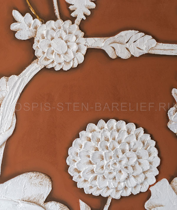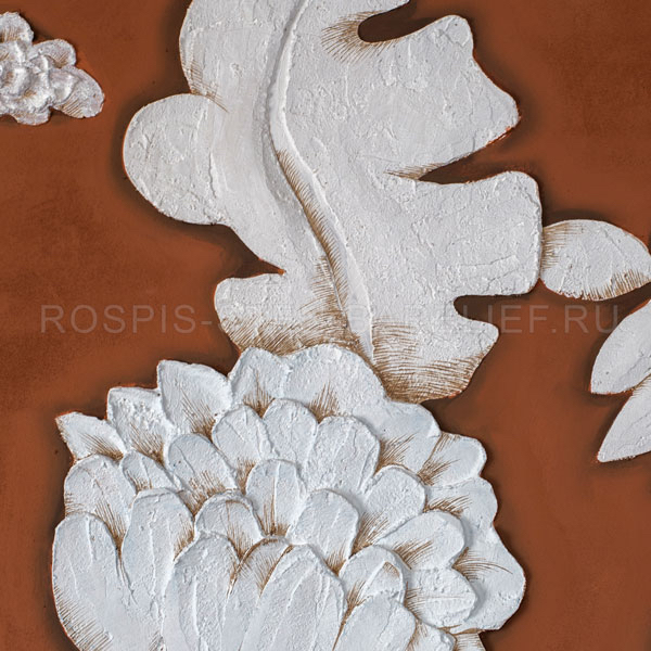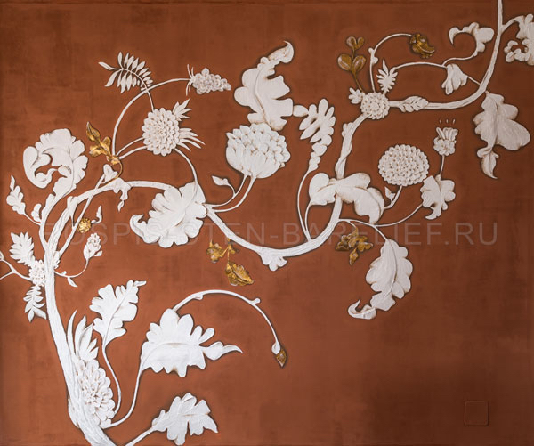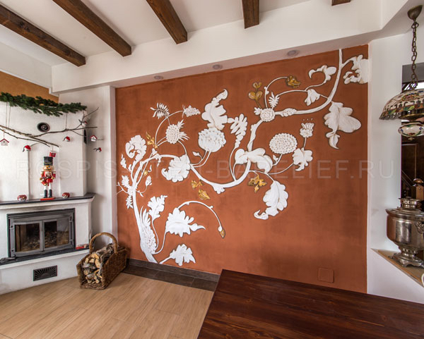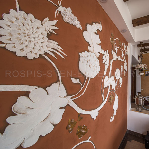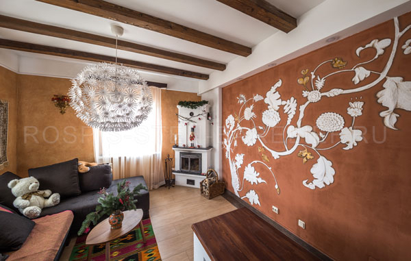 Кому интересно, расскажу как проходила эта работа. Заказчица сама имеет образование дизайнера одежды и посему примерное понимание чего хочет видеть на стене имеет. С цветами с моей стороны было решено сразу - обязательно использование цветов из цветовой гаммы интерьера и один близкий по тону, но отличный по цвету цвет - акцент. Таковым акцентом стал терракотовый цвет, который сразу внес тепло в дом, остальные цвета ( сиена и белый) можно найти в аксессуарах и мебели данного интерьера. Что касается рисунка, то была проделана капитальная работа по созданию эскизов, т.к. хотелось совместить мягкость, движение и декоративный орнамент. На мой взгляд персидский орнамент подошел под эти требования идеально. По изобретению растительного орнамента персы всегда держали пальму первенства, многие европейские растительные узоры заимствованы именно у них.
