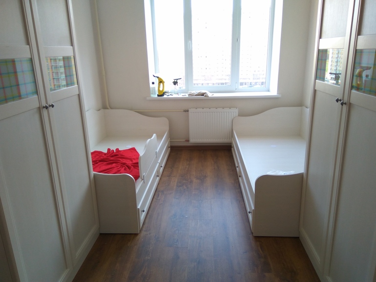 Сейчас тоже детскую делаем. Но решили пока взять кроватки маленькие 80х170(160), а когда деткам будет 8-9 лет уже покупать большие.