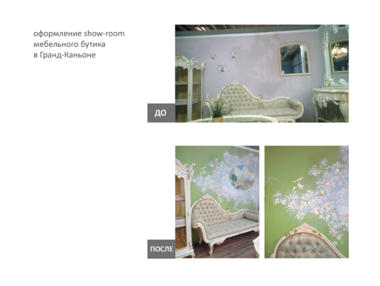 Решила поделиться опытом работы в этом царском стиле.) Предстояло оформить торговую точку мебельного магазина. Особенность заключалась в том, что мебель была выполнена в с стиле Рококо, который требует соответственного оформления - белый и воздушный с позолоченными вкраплениями. Надеюсь, что справилась с стоящей передо мной задачей.) Кстати, золотой рисунок нанести на стене, или нарисовать что-то на фасаде мебели, или покрасить рамку для картины, или фото рамку можно очень просто золотой акриловой краской, которая продается в художественных магазинах в маленькой баночке. Так же можно эмитировать любой метал: медь, латунь, серебро и т.д. Удачи!