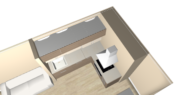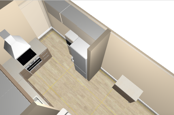 Вот наша кухня. Мы уж вертели по-всякому. Мужу нужно побольше рабочей зоны. :) Он у меня готовит. :) В помещении расчертили мелом, вроде не кажется, что очень тесно.
