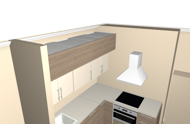 №19 -это навесной шкаф. Они под потолком будут, высота у них 40 см - они совсем не чувствуются и не давят. а на полу только хородильник и тумба с микроволновкой, глубиной 40 см. на визуализации видно. а на схеме вид сверху. там и стрелочка от шкафа не верхнего, если посмотрите.