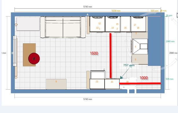 Замер должен быть по прямой) И как вам ниже написали, да он примерно 50-60см. Это мало. Подумайте о П-образной кухне. Развернуть компьютерный стол к тумбе под ТВ. Нужно ли делить комнату на 2 маленьких помещения..не будет ли вам темно?)