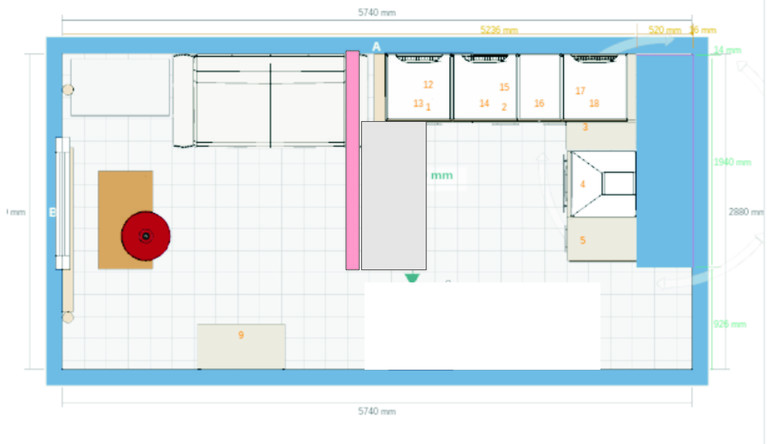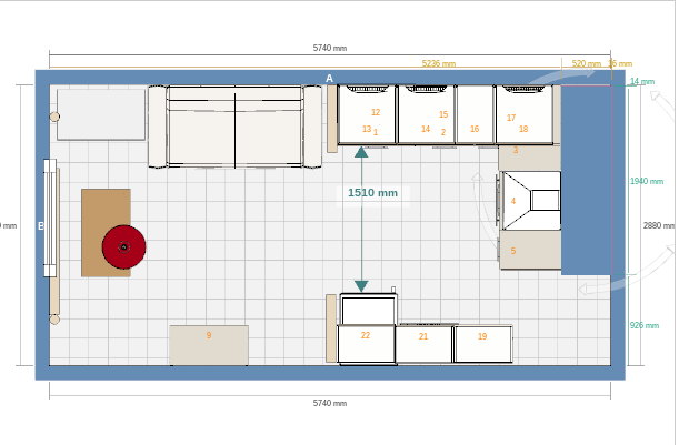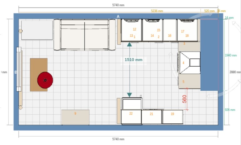 тесновато. У вас 750 мм до шкафчика № 21, и это нормально. Но до ближайшего шкафчика №19 гораздо меньше, наверное см 60, и выглядит довольно тесно. Вообще, я что-то не вижу шкафа №19 на 3д визуализации, только на схеме...