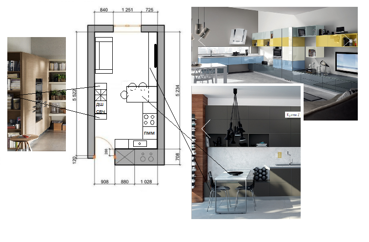 Стол обеденный 60*120см. ПММ 45см шириной. Можно мойку сделать 40см шириной, тогда ПММ войдет 60см)