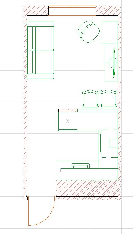 Мы сейчас живем с таким расположением мебели, он нам очень подходит. Очень удобно.Плюс нам необходимо полноценное спальное место, при этом изолированное. Не на каждый день. так что в планах еще или перегородка, или шторы, или японские. Еще не придумала.