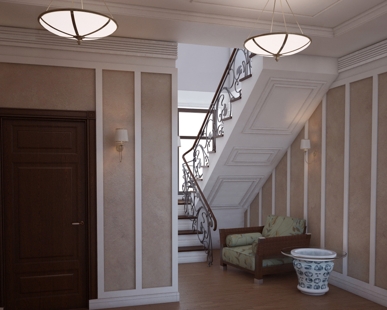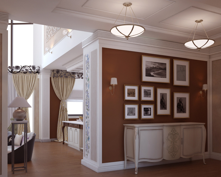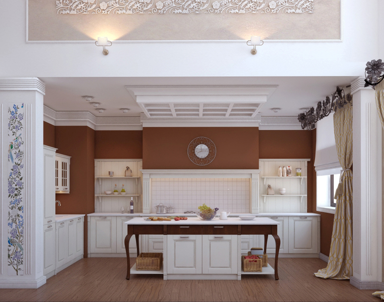 Основной стиль этого помещения классика, с нотками прованса, который располагает к приятному времяпрепровождения в загородном доме. Основная гамма коричнево-бежевая, любимая многими. Но засчет ярких моментов из прованса интерьер не смотрится скучным и однообразным.
