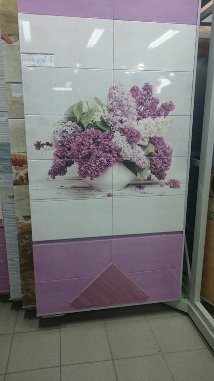 Качество неплохое, более менее ровная, кому нравится сирень- клиенты были в восторге от этой плитки. Но панно выходит шириной 1 метр ( если ванна 1700, то по краям остается всего по 35см белого, горшок с сиренью получается практически во всю стену над ванной )