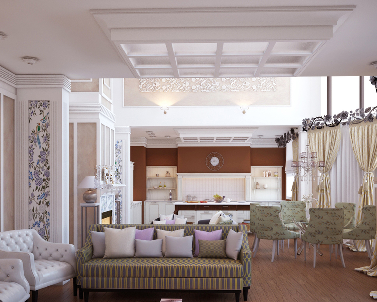 Можно, не меняя обоев добавить декоративные панели с растительными рисунками. Карниз потолочный сделать широкий, высота у вас позволяет. Простенок, на котором у вас висят часы я бы сделала акцентом на кухне, возможно стоит рассмотреть декоративный камин