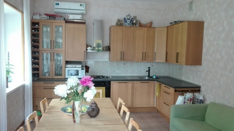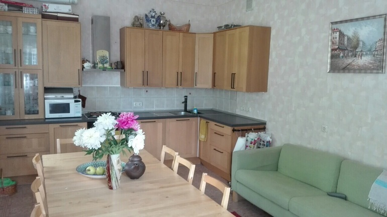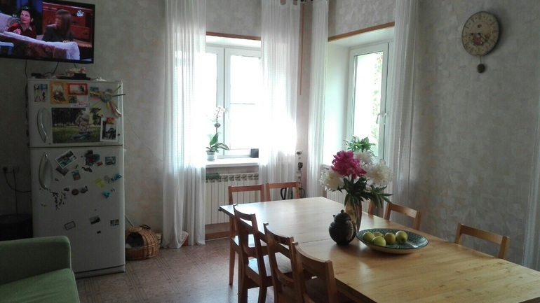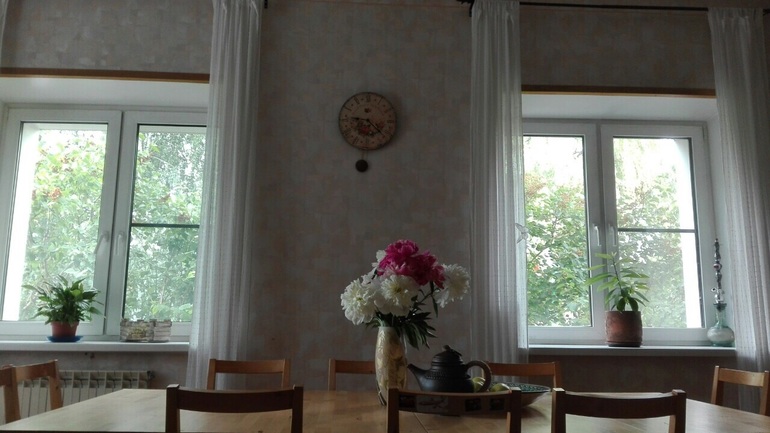 Имеется чудесная светлая кухня-столовая с прекрасным видом на сад в загородном доме.масштабного ремонта не планируется.кухонный гарнитур и стол остаются.под замену:стены,пол,шторы и старый диван.хочется чего-то не сложного и уютного...шторы думается типа римских,чтобы окна открытыми оставались...есть часы,которые заказаны спец для этой кухни...