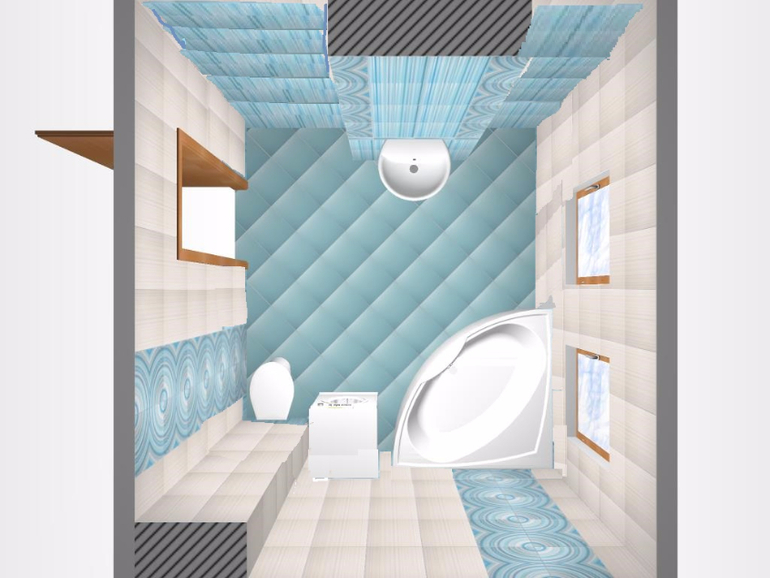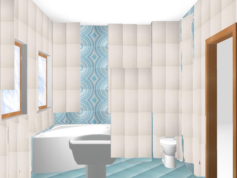 2 вариант: от первого отличается тем что убираем голубую плитку по низу и этой плиткой полностью выделяем стену с раковиной и нишами (над ванной полоска коряво выглядит, делала на скорую руку, смысл, надеюсь, ясен)