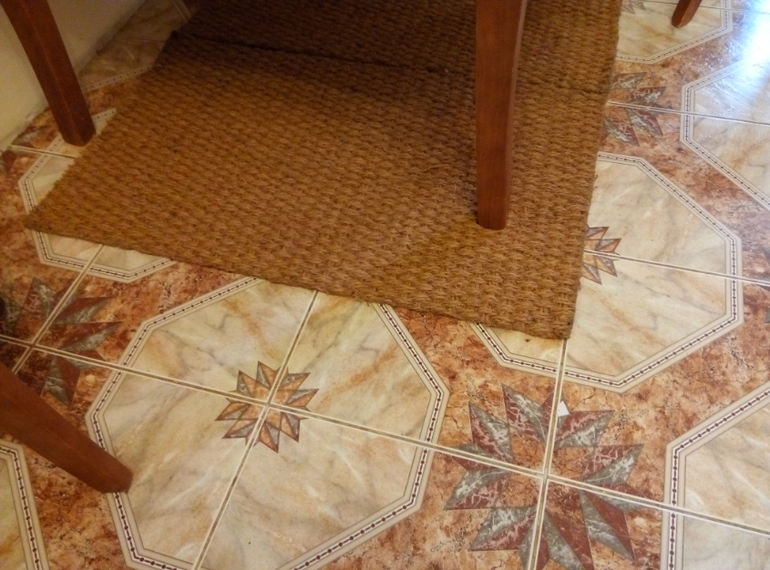 Но это не самое страшное. Она жутко холодная(((Бывшие хозяева положили под нее водный теплый пол, а батарею срезали на минимум. Потом пол у них протек(через лет 7-8 эксплуатации) и они его отключили. В итоге кухня холодная, пол ледяной. Ремонт и новая кухня не скоро. Чем застелить пол? Пока лежат везде коврики из кокоса икеа. Не очень удобно((( Большие ковры отпадают, у нас собака, два киндера 4 лет и муж хрюшка.
