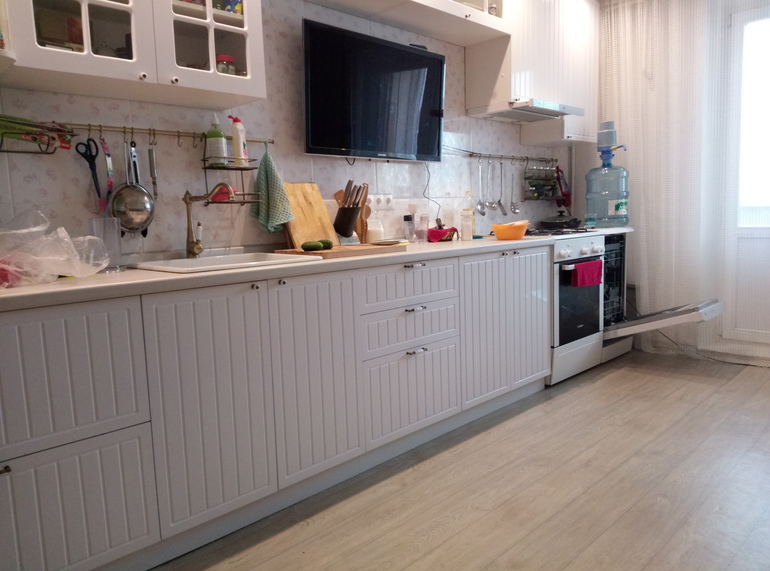 Трубы шкафам не мешают, потому как глубина шкафчиков всего 40 см. У них стандарт такой. Телик чистый, ни брызг, ни пятен жира нет. От плиты 60 см сбоку до него, не долетает, да и вытяжка все заглатывает. Вытяжку нам тоже пришлось тащить вправо, ее в коробе с подсветкой прятали над шкафами.
