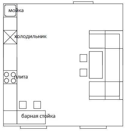 Я бы присмотрелась к букве "п". У вас длинная стена, далеко придется бегать. А с другой стороны двери поставить холодильник