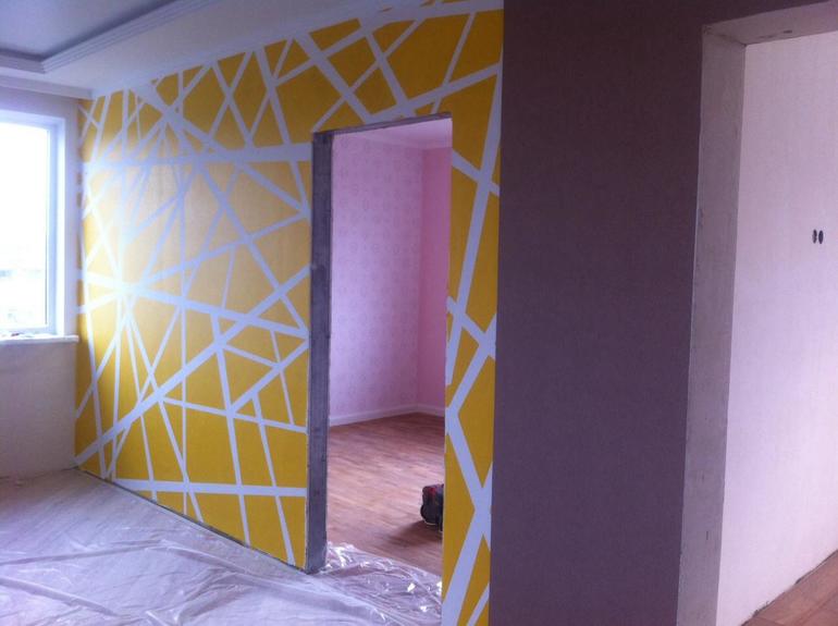 , но ниши под телевизор не будет. Вот теперь задумалась, что телевизор тоже черный и будет очень угрюмо.Надо бы стенку как-то смягчить. Может покрасить на темный графит светло серые полоски , как на этом фото только немного меньше самих полосок.( фото с ББ). Видела в какой то передаче по ТВ. Очень красиво.Что скажите? Может кто еще какие фоточки емеет. Буду благодарна.