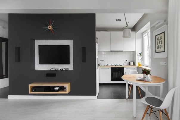 Интерьерное решение гостинойДевочки,задумала я в кухне-гостиной одну стену заложить кирпичиком, а напротив покрасить в темный графит . Примерно как тут