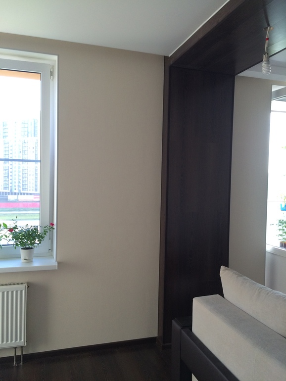 Вообще, это стена несущая, к которой со стороны прихожей пристроили стены для встроенного шкафа. А со стороны гостиной получилась неглубокая ниша, под стеллаж для книг, всякого декора. Зеркало - это дверцы