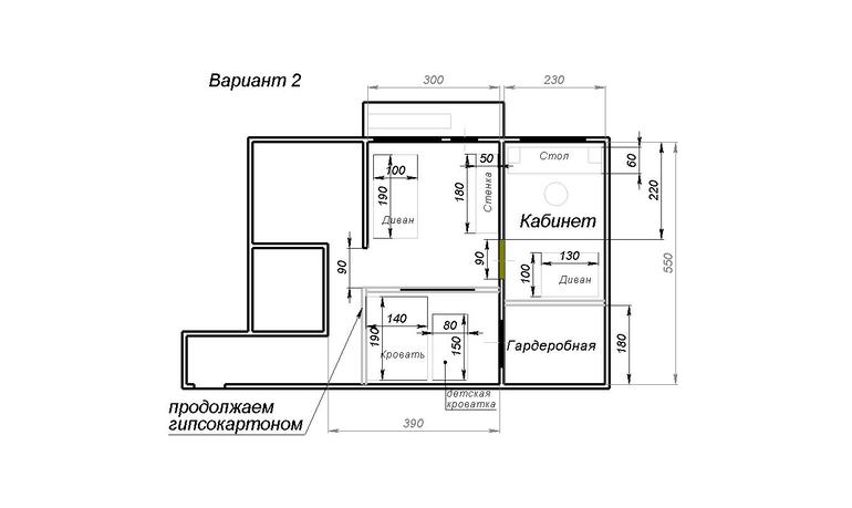 Перепланировки стен. Согласование перепланировки квартир и нежилых помещений.Планирую перепланировку стандартной хрущевки-двушки. Нужен кабинет, спальня, общая комната и место для кроватки, с перспективой далее какую то комнату отдать ребенку целиком. Перегородки из гипсокартона, двери купе по максимуму, полупрозрачные. Возникло вот таких два варианта - покритикуйте меня пожалуйста. В первом варианте не нравится проходная гардеробная мужу. Во втором варианте мне не нравится маленькая общая комната и обоим не нравится длинный узкий коридор. Большой диван 190х100 продавать не собираемся, его надо как то вписать в планировку. Что бы еще придумать?