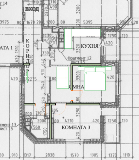 я изначально рисовала кухню в коридоре буквой Г-по стене большого с/у. но с дверями фигня получалась в ванну и спальню.