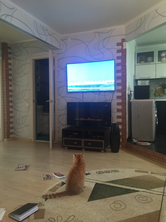 Здесь телевизор, и тут вопрос... Если этот участок сделать камнем? ( если да, то какой цвет?) или может ламинат туда положить? У нас рыжий камень по всем углам и внизу на ступеньки кухни, его или перекрашивать, или избавляться от него.... Не знаю....