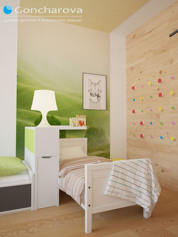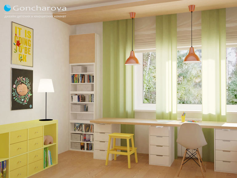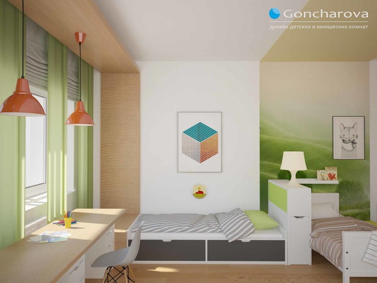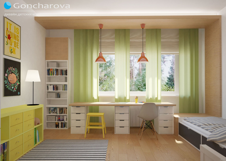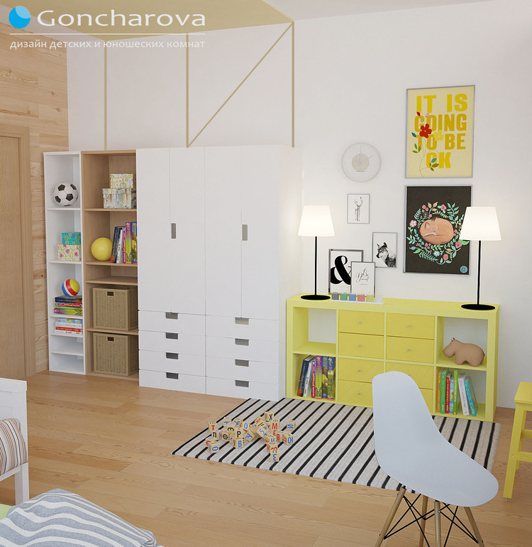 Авторские проекты дизайнеров.(Посты не по теме будут удаляться!)Старший сын уже школьник, а младшему до школы еще далеко. У меня было задание обустроить достаточно большую солнечную комнату, предусмотрев кровати на вырост и полноценное рабочее место. Пожелания были с расчетом на будущее: дизайн должен легко приспосабливаться под изменяющиеся вкусы детей. Пожалуй, натуральные текстуры дерева и скандинавские контрасты не выйдут из моды еще долго.