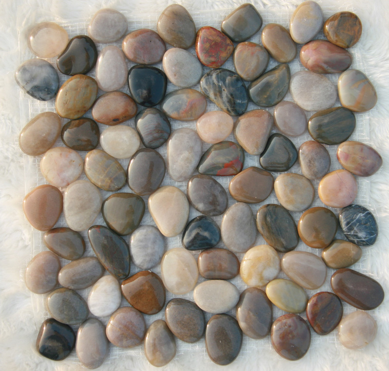Это галечная мозаика, она продаётся там же, где и плитка, искуственный камень. Камешки уже наклеены на сетку, остается приклеить их и затереть, как обычную мозаику. Но подумайте, это удовольствие не из дешёвых, при том что многие после некоторого срока эксплуатации отдирают это покрытие обратно)