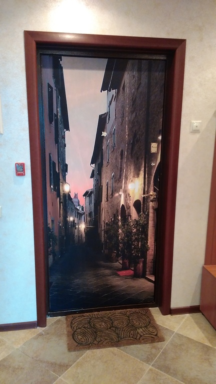 Сейчас сложно ответить на этот вопрос. Может быть и попадалась когда то такая идея. Но сейчас пришло в голову именно из-за непонравившегося фасада двери. А что на дверь подойдет лучше, чем перпектива куда то вдаль. Покупка обоев была спонтанной. Покупали в детскую и заодно решили и в коридор взять. Что было в магазине из перпектив городских, то и взяли)