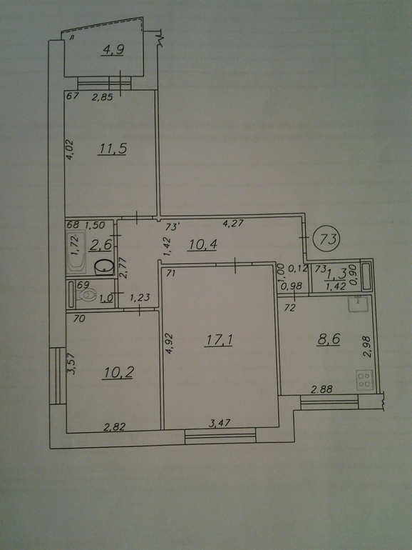 а если сделать вход в комнату 10,2 из гостиной, туалет с ванной немного поменять местами и на всю ширину коридора расширить ванную, которую поменяли местами с туалетом?