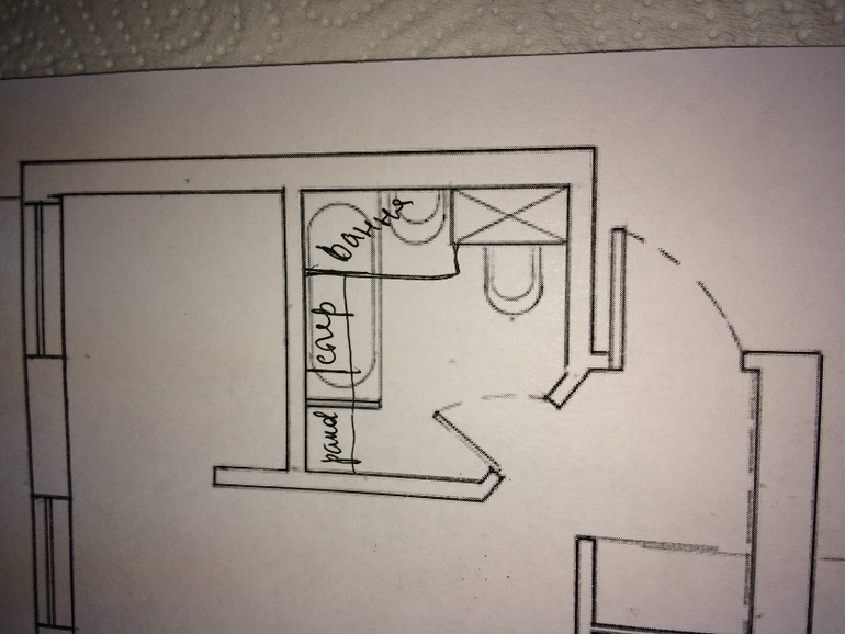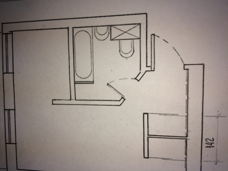 Душ планируется, а вот унитаз некуда перенести, там трубы, итак их все перевалили ближе к стене, стояка у нах нет, дом кирпичный просто трубы холодная и горячая, далеко друг от друга