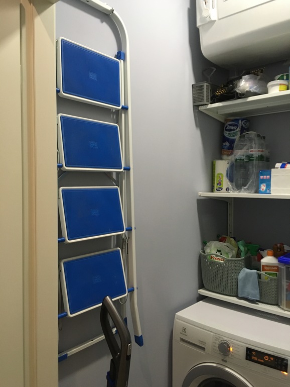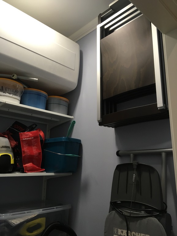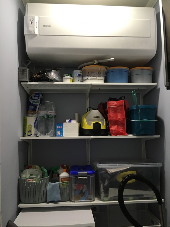 В комнате поместилось все, полноразмерная машинка с мушкой, гладилка, сушилка напольная, бойлер на 150 литров, 2 пылесоса, пароочиститель, вся бытовая химия, корзины для грязного белья, остатки ремонта, 4 гостевых стула, инструмент мужа. Осенью на полки встанет консервация) Там же располагается технический люк. Одним словом я мега довольна как все получилось, в предыдущей квартире все эти вещи хранились по шкафам, на балконе, на кухне а сейчас все в одном месте. Единственное о чем жалею, что не сделала там гигиенический душ, для налива ведра или пароочистителя... не догадалась(