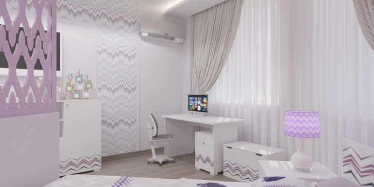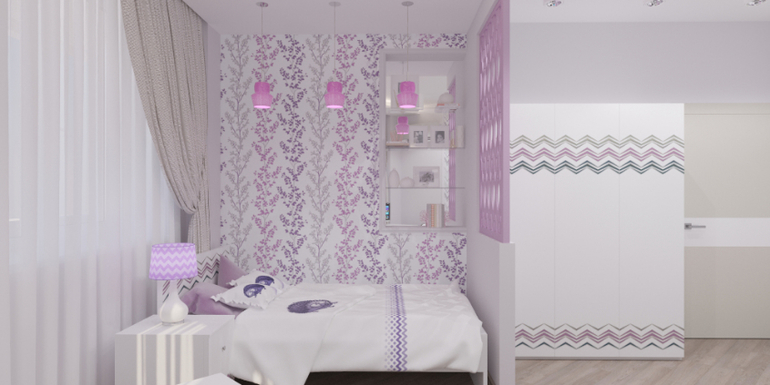 ТВ у мальчика висит удобно. У девочки из-за "кривой" многоугольной комнаты действительно сложность с тв. Но решили повесить там и использовать поворотный кронштейн. так же родители решили использовать переносные кресла-мешки для просмотра тв - на кроватях категорически не разрешают смотреть тв.