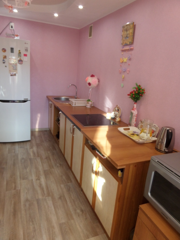 Для меня розовые стены и цветные фотообои уже много поэтому я бы сделала нейтральный светлый фартук