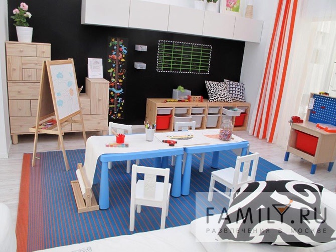 Интерьерное решение детской комнатыЗдравствуйте, дорогие мамочки. Думаем над оформлением игровой зоны, которая будет расположена напротив кроватей для двух разновозрастных мальчишек. Так как у нас очень много игрушек, особенно конструкторов, лего и тд, остановили свой выбор на ящиках-шкафчиках выдвежных от тм икеа труфаст. Кажется, что это будет самый удобный вариант. В результате план таков. Поставить три таких модуля, каждый в длину почти метр(99см), рядом с друг другом, по центру стены. Т.е. с каждой стороны еще останется свободных по 130. Над центральной полкой шкафом - по плану теевизор (но он будет не скоро, пока на этом месте временно повесим картина, или фото). Цвет каркаса думаем выбрать деревянный, а ящиков белый. Возле окна на этих 130 см хотим сделать творческо-читальную зону. Полочки для книг, повесить на стене которая с окном, непосредственно, а рядом творческую зону. У нас имеется такой столик красно-синий, его можно ставить в этот угол. Для удобства можно его перемещать. Возле окна по центру комнаты ставить, если хочется почитать с детками в этом уголочке, на пуфиках, например. Т.е. Сделать столик мобильным. Еще есть идея, сделать здесь грифельно-магнитную доску. И не только здесь, а полностью на всю стену до конца, до двери. Как на картинке. Но не до потолка. До навесных шкафчиков, они будут тоже белого цвета. но Будет ли удобно деткам здесь рисовать? Вот в чем вопрос, на картинке конечно все красиво, а вот насколько она будет пользоваться популярностью? Хотелось бы услышать комментарий по этому вопросу. Так как красить уже будем начинать в ближайшее время.