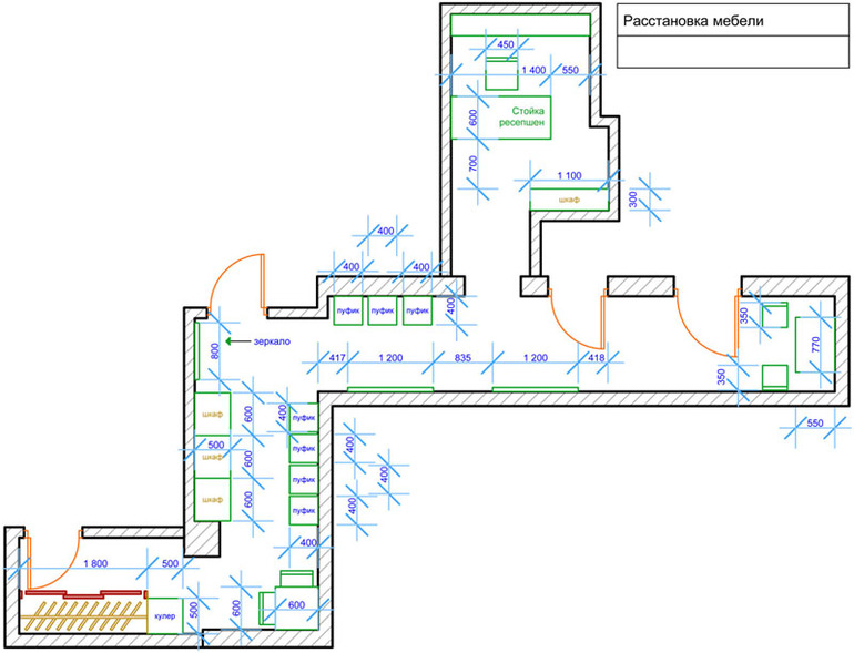 По середине коридора проход и там расположена стойка ресепшен, во всех помещениях установлены камеры и девушка администратор видит все,что происходит в помещениях.