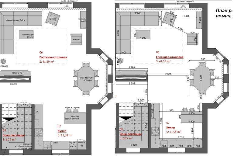 На картинке часть первого этажа с кухней и гостиной. Я уже всю голову сломала. Сначала хотела мойку напротив окна, но насколько это практично? У кого так есть? Может мойку угловую сделать на две секции? Но тогда не будет в углу большой тумбы для хранения посуды…