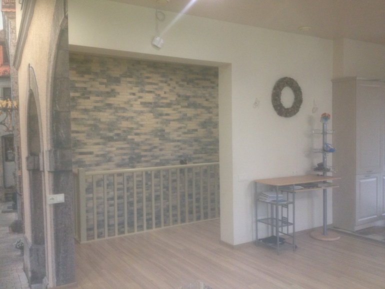 Верхнюю часть над аркой хотим оформить такими же кирпичиками, как на дальней стене. Вопрос стоит ли заходить этими же кирпичиками на стену с венком или лучше закончить на границе арки и стены?