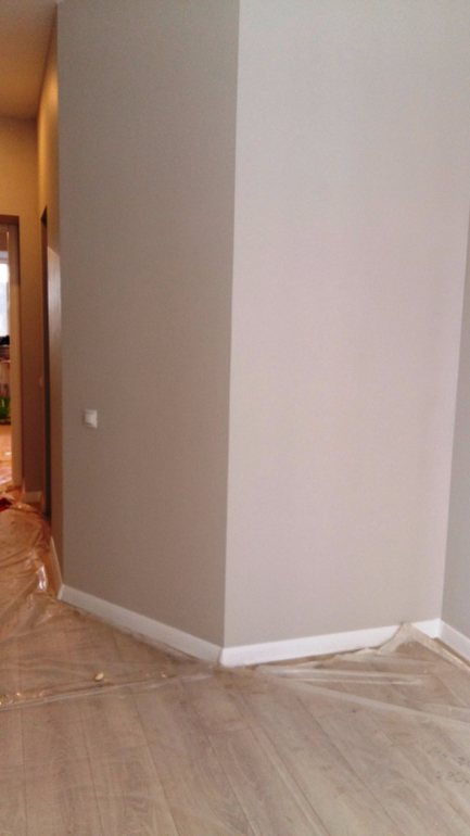 Цвет стен - краска Dulux Египетский хлопок. Со стенами хитрость. Наклеен стеклохолст и сверху в два слоя краска (без шпаклевки). Стены во всей квартире, кроме санузла в одном цвете. Это мне было важно для расширения пространства. Пол тоже в одном цвете, ламинат везде, включая кухню. Только у порога муж настоятельно требовал плитку. Подобрала в тон ламината.