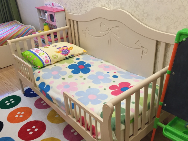 Мы свою детскую в мистер дорс заказали. А чего вы сразу 2 кроватки не взяли одинаковых? хоть и малышка ещё, там же тоже есть бортик, может можно было сделать его длиннее. т.к. на заказ.