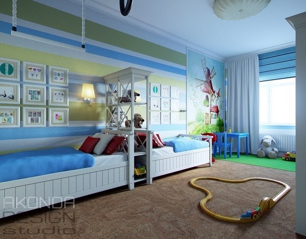 Кровати будут стоять возле стенке, как на первом фото, между ними этажерка.
