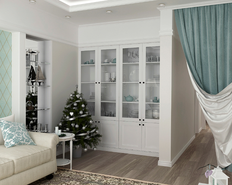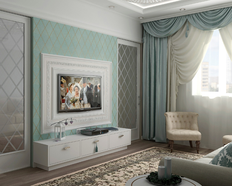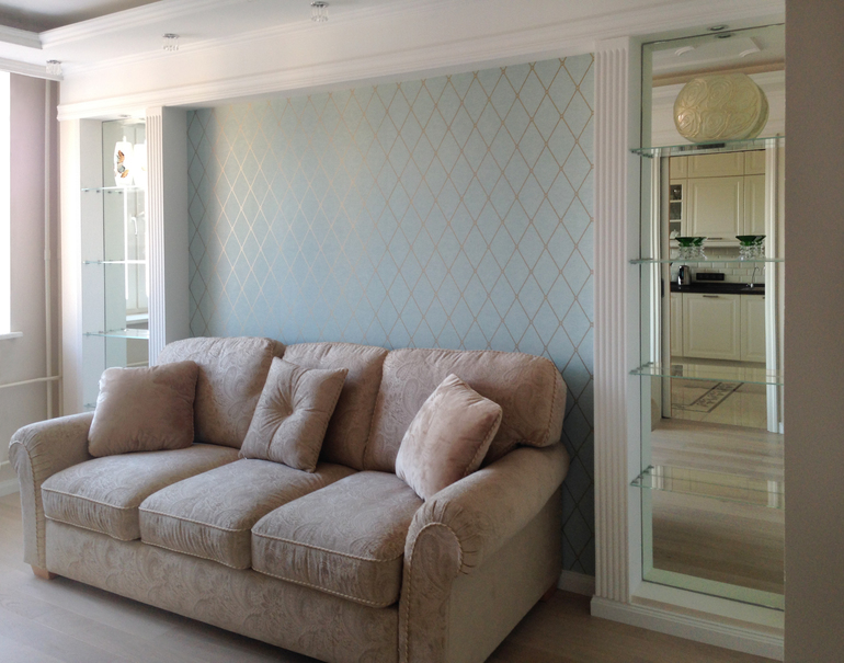 Дизайн гостиной был выполнен в нежно-бирюзовой гамме. Несмотря на холодный оттенок, в комнате все равно создается уютная и расслабляющая атмосфера. Диван встал в неглубокую нишу, выстроенную двумя стеллажами. Неброский ромб в рисунке обоев смотрится очень изысканно. Задние стенки стеллажей сделаны зеркальными, что играет на расширение пространства. Стеллажи расположены напротив двух раздвижных дверей на кухню. Все направляющие спрятаны в короб, двери сделаны по раздвижной скрытой системе пенал. В нише при входе встала встроенная витрина, которая одновременно является и системой хранения.