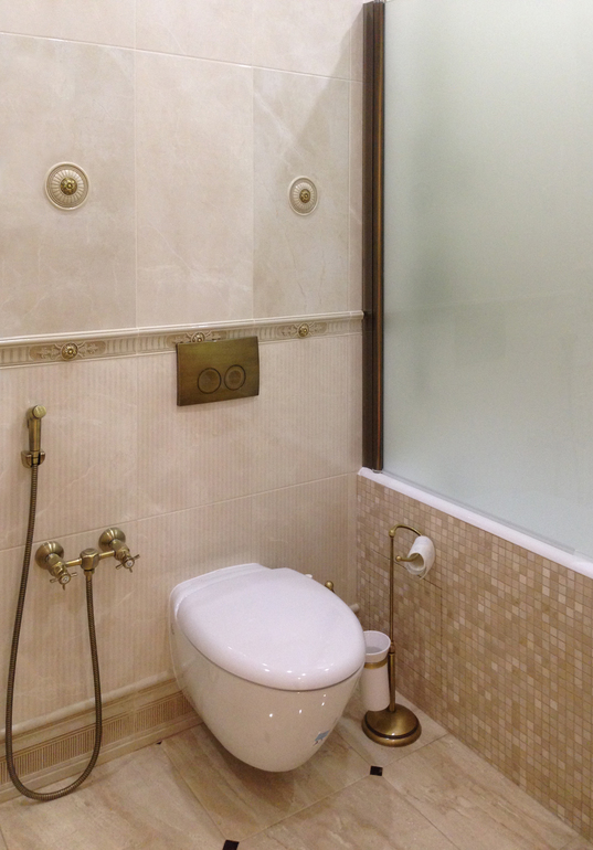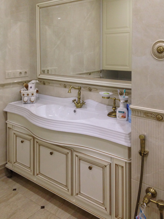 Санузел полностью соответствует дизайн-проекту. Роскошная тумба вживую выглядит еще эффектнее. Круглые розетки на медальонах и бордюре красиво перекликаются с бронзовой сантехникой.