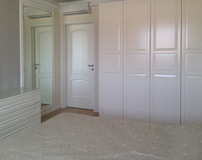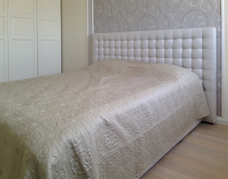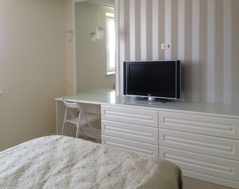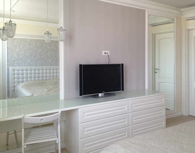 Спальня точно соответствует проекту. Пока увы отсутствует текстиль, и стульчик возле туалетного столика временный. Но основная красота уже на месте. Телевизор впоследствии займет свое законное место на стене и скроет розетку.