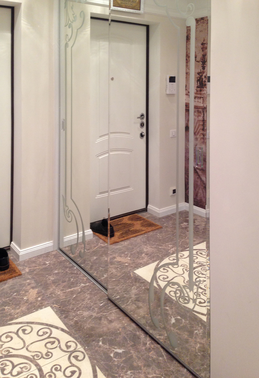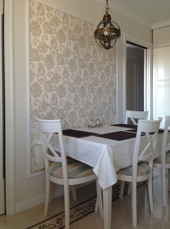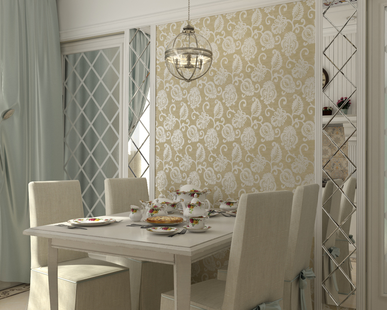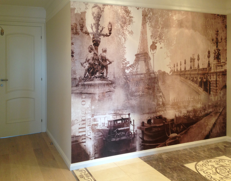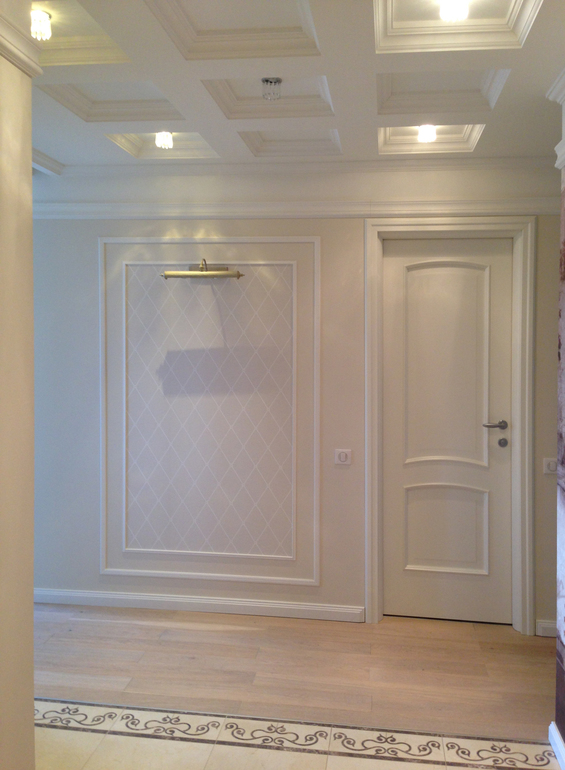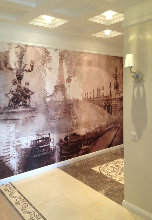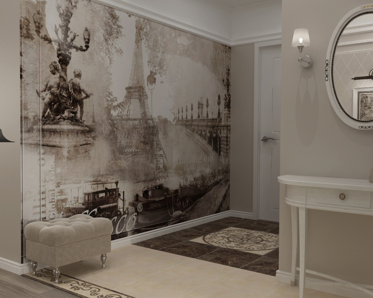 Просторную прихожую украшает большая фреска во всю стену с изображением парижских мотивов. При входе за зеркальными дверцами, в которых отражается фреска, спрятана просторная гардеробная. В коридоре обои из той же коллекции, что и в гостиной. Узор с лаконичными ромбами, но уже в бежевой гамме, ограничен рамами из молдингов.