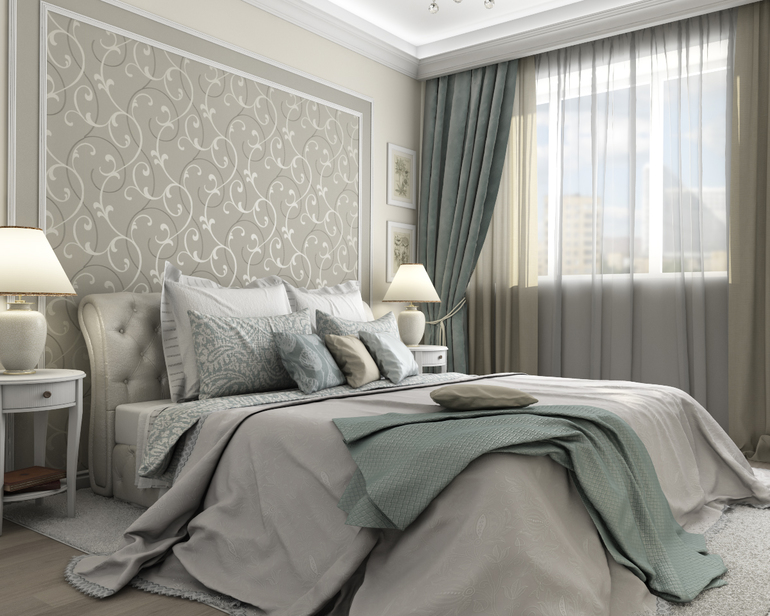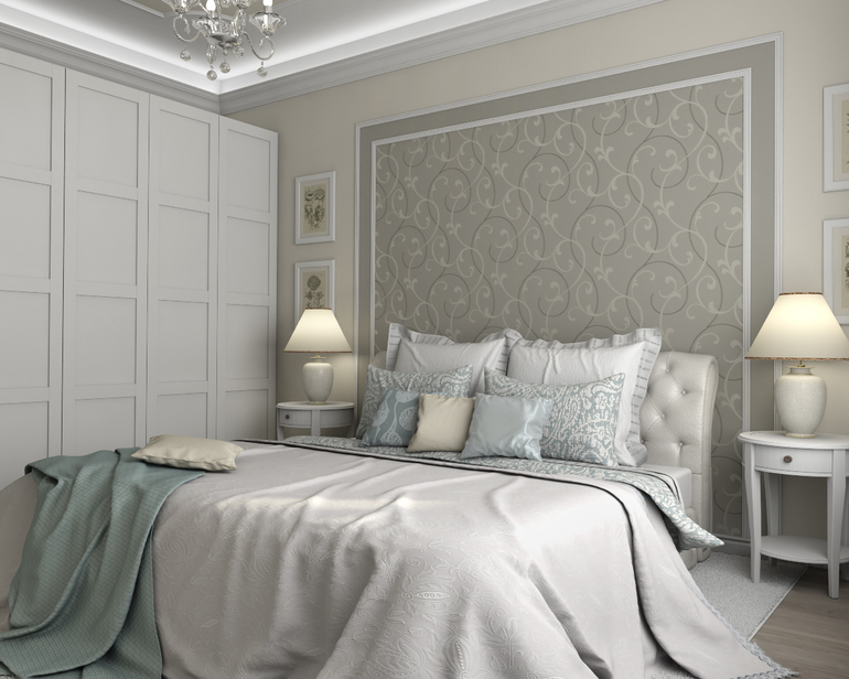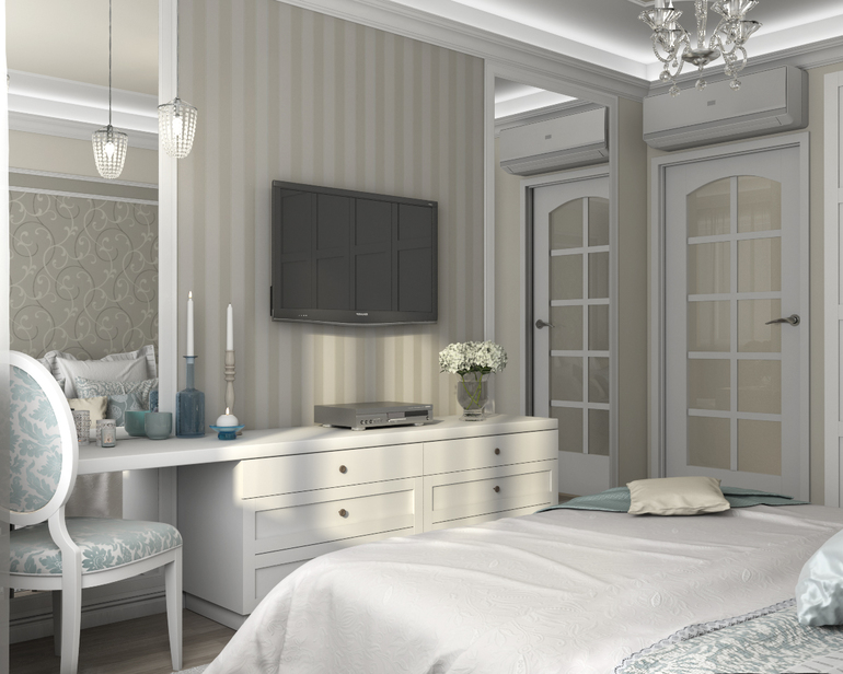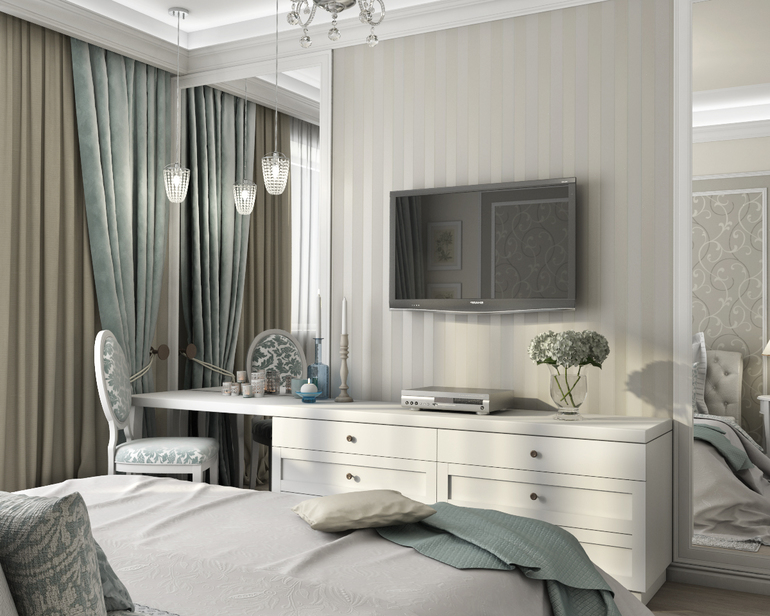 Дизайн спальни выполнен в серебристо-бирюзовой гамме. Бирюза в этом помещении только в текстиле. Серебристые обои красиво переливаются на свету. Зеркальные полотна визуально увеличивают небольшую комнату. Хрустальные подвесы у туалетного столика красиво гармонируют с центральной люстрой. Вместительный гардеробный шкаф расположился слева от входа. Дополнительной системой хранения является комод, сделанный под заказ, который плавно перетекает в туалетный столик.