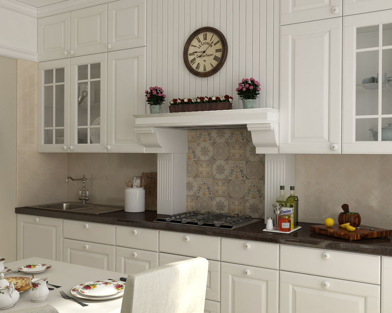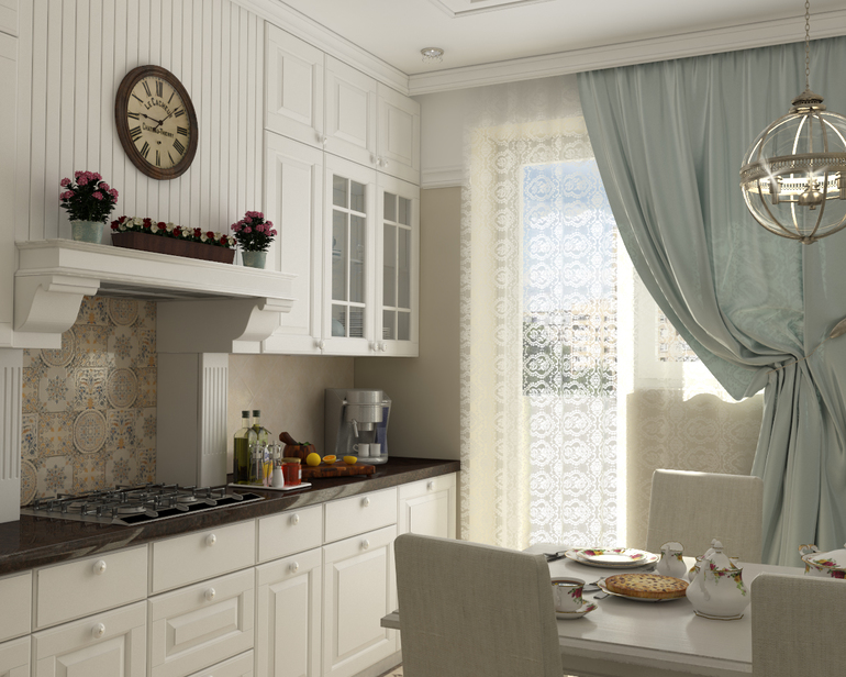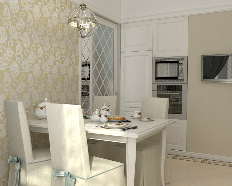 Кухня выполнена в той же стилистике. Гамма светлая в бежевых оттенках. Нотку прованса добавляет декоративный короб над плитой, в котором спрятана встроенная вытяжка. При входе в нише встали встроенный холодильник и стойка с духовым шкафом, за счет чего получилась большая рабочая площадь на кухонной столешнице. Над обеденной группой расположился потрясающий подвес, похожий на круглый фонарь. Основным источником освещения на кухне является потолочный витраж, дополняют его встроенные светильники с хрустальными подвесками.