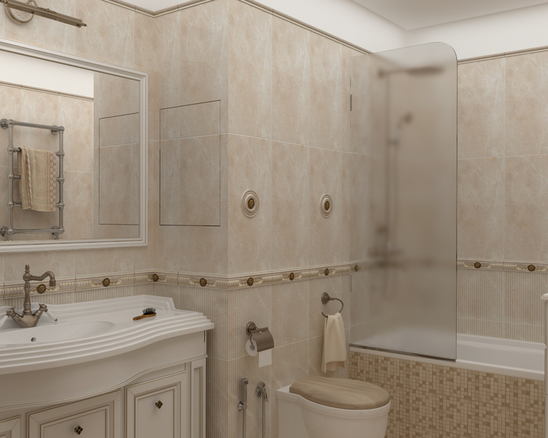 Дизайн совмещенного санузла выполнен в бежевой гамме. Главным украшением является роскошная тумба с раковиной, которая красиво гармонирует с выбранной коллекцией плитки. Объемные бордюры и медальоны дают игру фактур и оживляют однотонную плитку. Вся сантехника и декоративные элементы подобраны в бронзовой гамме.